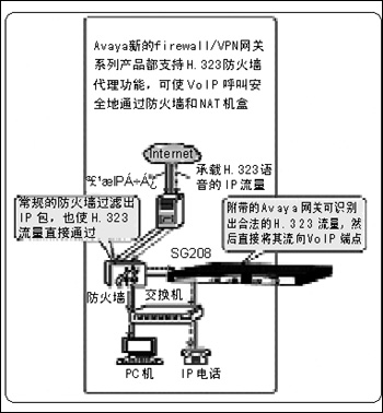 Avaya公司计划在近期推出几款网关设备,以支持IP电话呼叫能安全地通过防火墙。其中,包括SG5/5X和MG200系列的firewall/VPN设备。这些新产品的一个重要特性就是对H.323 VoIP协议的支持,这样可使VoIP安全、方便地部署在远程节点上,而且新的设备也可与现有的firewall/VPN设备协同工作,或用来建立某个安全基础设施。同时,H.323代理功能可使Avaya的IP电信呼叫置于Internet上而不受某个公共防火墙的干扰。