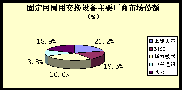 (2)市场特点:市场份额进一步向业内领先者集中,华为技术、上海贝尔、BISC 依然保持该领域三甲地位,市场份额占市场总量的67.3%。上述三家厂商各自的市场份额分别占到市场总量的26.6%、21.2%、19.5%。 此外,以中兴通讯 、华为技术为代表的非外资设备厂商积极开拓国外市场以实现其国际化发展战略。 中心城市市场趋于饱和,市场竞争焦点向本地网机型拆换和中小城市以下市场转移。激烈的价格竞争导致该市场平均利润微薄。