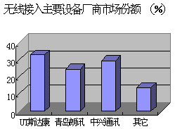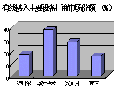 (2)市场特点:窄带接入仍然是有线接入市场的主流,以Honet、ZXA10为代表的窄带有线接入占市场90%以上的份额。xDSL、HFC、LMDS、千兆以太网技术等宽带接入虽然热浪涌动,但限于种种原因尚未大规模商用。中兴通信、华为技术、上海贝尔稳居有线窄带接入市场三甲地位,市场份额之合占市场总量的83.6%。各自市场份额依次为27.8%、38.0%、17.8%。无线市话接入设备市场基本是UT斯达康、青岛朗讯、中兴通讯等几家公司的天下,市场份额之合占市场总量的86.4%,各自市场份额依次为32.6%、24.3%、29.5% 。