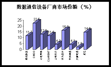 (2)市场特点:由于非外资设备厂商的崛起,数据通信产品价格持续下降,中低端产品竞争尤为激烈。华为、中兴等公司在高端接入服务器、路由器等领域已取得突破,市场份额稳步攀升,在高端接入服务器领域,非外资品牌已占到60%以上的份额。IP网络设备继续被CISCO等少数公司垄断、非外资厂商试图有所作为但收效甚微。运营商高涨的投资热情与设备厂商的大力推动,是数据产品市场迅速扩张的拉动力量,网络带宽的不足以及运营商Qos的局限依然是该市场飞跃发展的瓶颈因素。