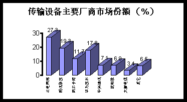 (2)市场特点: 高端传输设备受到推崇,10G、40G、320G DWDM系统已成为干线网络传输设备市场的主流,传统的SDH设备市场不断萎缩。市场竞争激烈、市场集中度有所降低,尽管北电网络与朗讯科技两家独占42%的市场份额,但华为技术等非外资厂商已经以总和超过30%的市场份额步步紧逼。更新的技术与设备不断涌现,朗讯科技的光路由交换技术打开了通往全光网络之门,阿尔卡特Crosslight 光交叉连接系统可极为灵活地实现对各种光接口的支持,西门子DWDM实验系统传输能力已达到3.2T。