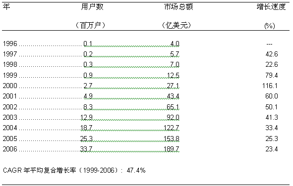 图一: 美国宽带接入服务市场的增长历史和预测 1996-2006