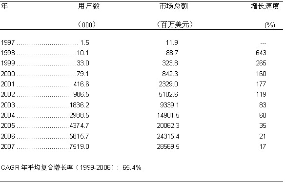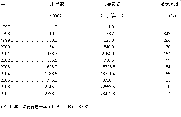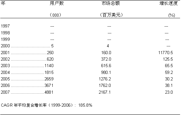 图一: 美国宽带无线固定接入市场的增长历史和预测 1997-2007