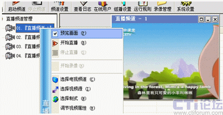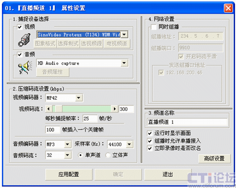 用鼠标右键点击直播频道管理下的某个频道号,我这里选择01:在弹出的右键菜单中选择“直播频道设置”或者点击工具栏里的“频道设置”图标,出现下面的设置图: