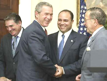 (图为:布什和FCC主席迈克尔·鲍威尔握手)