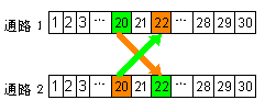 直接把要交换的Channel的对应时隙的数据拷贝到通路(或另一通路)中要交换的时隙位置即可。下图3显示了两个E1支路上不同通道(Channel)间的交换情况。