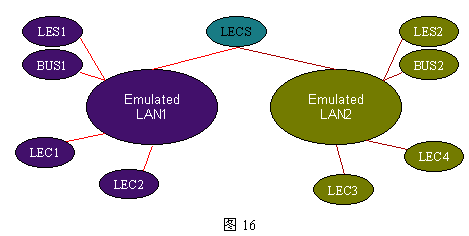 每个ELAN(Emulated LAN)由一组LANE客户(LEC)和LANE服务构成。LEC还可以是作为ATM主机代理的网桥和路由器。LE服务由三个不同的功能实体构成:LAN仿真配置服务器(LECS)、LAN服务器(LES)和BUS,这三个服务实体可以各自存在,但通常位于同一设备,例如:LES可以位于ATM交换机、路由器、网桥和工作站。ATM LANE的构成及相互关系如下图16所示: