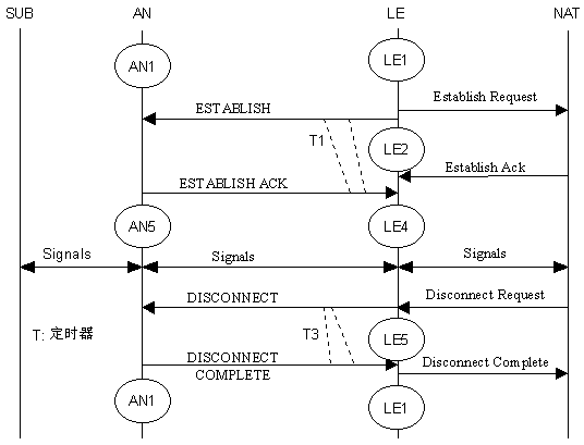 用于透明向交换机传输用户线状态信息。其中的LE部分负责完成呼叫控制和增值业务功能;AN负责用户线状态识别、铃流产生等功能。下面两个图分别表示呼叫从用户端发起和从交换机端发起的信令过程。