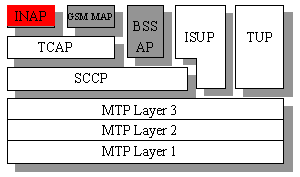 智能网的通信采用SS7信令,SS7信令系统中的智能网应用部分(INAP)是专门用于智能网通信的。INAP是建立在TCAP和SCCP协议层之上的,在下面SS7协议栈中可以看出INAP在SS7协议栈中所处的位置: