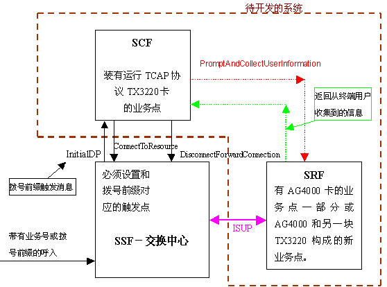 NMS通信公司提供的SS7产品已经实现了MTP1、MTP2、MTP3、SCCP、TCAP、ISUP、TUP等各层的功能,开发人员只要在此基础上开发一些INAP函数就可以实现相应的智能网业务。下面以实现SCF和SRF功能为例,说明软硬件环境、实现业务的功能框图、INAP函数的描述。