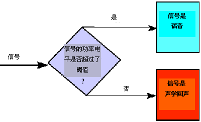 声学回声的一般频谱特征类似于语音的频谱特征。类似地,声学回声路径中的非线性特征会引起回声和原始语音音节之间的不一致。因此,有效语音和对应的声学回声之间的电平差异(振幅差异)提供了相应的信息,使用该类信息,可将声学回声从主流语音中分离出来。在图4中,给出了识别某一信号是有效信号还是声学回声信号所采用的逻辑方法的概念视图。