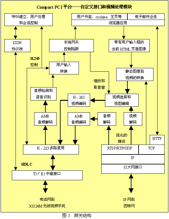 图3所示为网关重要组成的分解图。网关机箱很可能是一个Compact PCI机箱,机箱中包含了作为网络中一个节点的所有组件。基本的视频呼叫和浏览器应用可以运行在主处理器上,但T1或E1接口需要由附加模块来支持。为了支持大量的端口,还需要附加的以太网接口和自定义的视频处理模块。T1/E1接口通过公共电话网接入无线交换中心,也可以直接接入到无线交换中心。以太网接口会通过标准IP路由器接入到因特网。