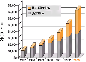 为了获得竞争优势,业务提供商──传统长途运营和本地交换运营商,因特网业务提供商(ISP),应用业务提供商,以及无线运营商──都在想方设法发布基于IP的业务,这些业务应该:对用户有较高的价值,能缩短面市所需时间,部署是低成本高效益的。向用户提供高价值的增值业务能为业务提供商带来重要的收入源泉,并使他们更有特色,增加市场分额,特别是如果这些业务以快速、易于支持的方式部署,以上这些优势就会更加突出。据估计,到2003年增值业务设备仅在美国就能达到73亿美元的市场,正如图1所示。