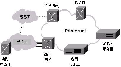 在下一代网络的体系结构中,信令和呼叫控制功能被从媒体处理和网关功能中分离出来。IP媒体服务器和媒体网关、信令网关、以及软交换联合在一起工作。图2说明了这些组件之间的关系。