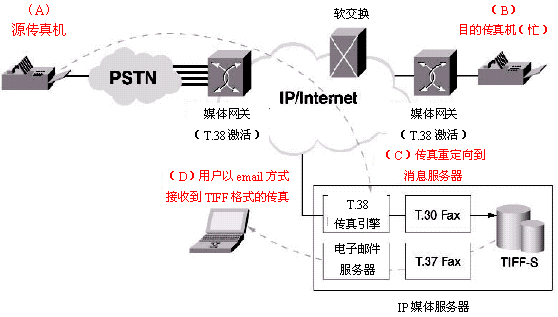 T.38规定了实时IP传真的标准。因此,源于PSTN的一个传真会话能够以T.38的格式进入IP网络。在IP媒体服务器中通过使用T.30,T.38和T.37,实时传真会话可以把IP媒体服务器作为终端,并把实时传真转换成T.37兼容的传真消息。然后,这个传真消息会被用来产生一个就象一个电子邮件会话的T.37传真。这使得IP媒体服务器可以提供"永不示忙"的IP传真功能。这个功能也将为统一消息应用提供基于IP的传真邮箱能力。