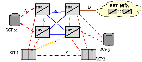 下图显示了各种类型的链路,各种类型的链路在物理上都是DS1或T1或E1中的一个时隙。这些链路类型 的定义和具体连接两节点的链路配置有关,定义这些链路类型的目的,是为了更好地管理网络,特别是为了减少网络中断的可能。为了提高网络的可靠性,必需要有多个通道可以传送消息。在ANSI和ITU-T的标准里,都有相应的规则说明如何通过各种类型的链路传递消息,(如下图所示的网络中,当从SSP1往SSP2发消息时,首先试图从A链路发送消息,如果消息发送不出去,再试从F链路发送)。以及如何避开网络瓶颈传递消息。