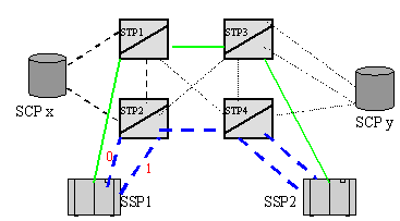 如下图所示,蓝色的五条链路组成SSP1到SSP2的路由1,绿色的三条链路组成SSP1到SSP2的路由2。路由1和路由2组成SSP1到SSP2的路由集。