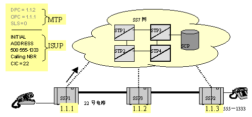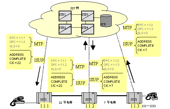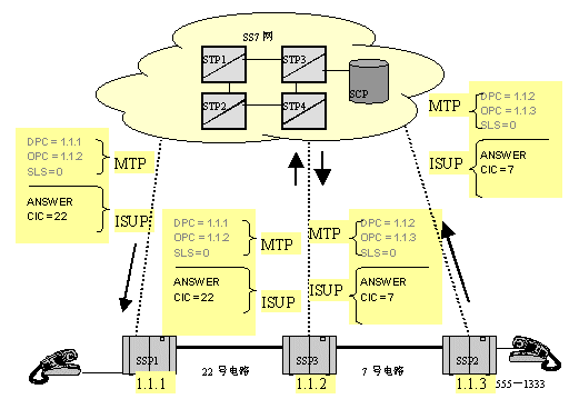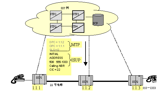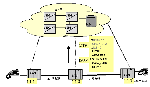 SS7协议的MTP层完成发送消息路由方面的所有工作,包括查路由表,发送DPC,源信令点(SSP1)编码,以及占用的电路号CIC。ISUP层处理IAM消息,包括主被叫号码信息。