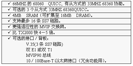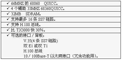 TX3000卡的功能大致和TX2000卡相同,但它比TX2000的性能2.5至5倍。TX3000卡上有一个66MHZ的68060协处理器。TX3000卡为SS7应用配置1至4个QUICC通信控制器,最多16条信令链路,提供一个三口V.35,拥有双T1或双E1接口。(主板上标准配置一个QUICC,支持四条SS7链路,当CT总线和串行接口都要使用,或者处理的链路超过4条时,可先配置有三个QUICC的背板,四个QUICC可支持16条SS7链路)。