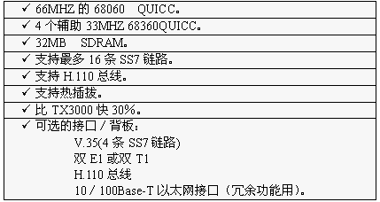 TX3000在新版软件中可以支持冗余功能,冗余功能可以使系统能检测并恢复以下各种故障:TX SS7板上的链路故障,信令点故障,或者是TX SS7板本身的故障。每对冗余TX3000卡通过一条专用以太网交叉电缆相连接,别的卡或设备不能连接到这一专用以太网连接上。TX3000的主要特性如下表所示: