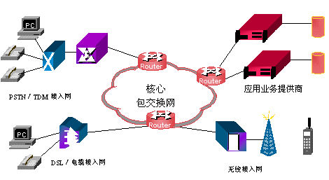 未来的网络将会以基于数据包的网络为核心,交换系统以IP交换和ATM交换等构成,能实现包括语音、数据和视频的所有交换需求。各种接入网,如:无线网、有线电缆网、DSL、TDM(时分多路复用)交换网等,通过路由器接入到核心网络。