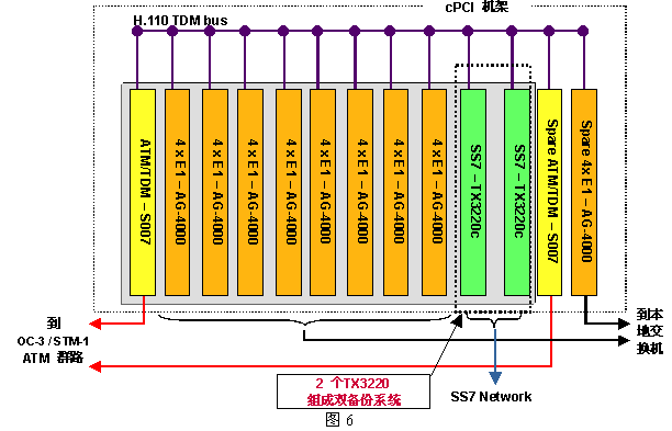 为具体起见,图6给出一个960话音端口的应用方案,其中用到了三种NMS公司的设备:AG-4000c、S007和TX-3220c,图中未列出用来运行应用程序的CPU板(AG4000系列板卡不含CPU,而AG600eC包含了CPU)。