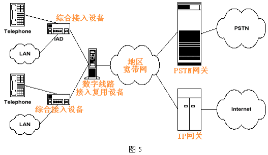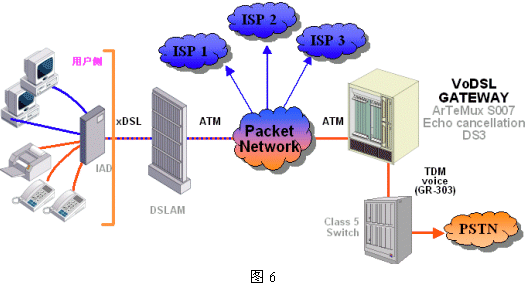 这种方式又称为VoMBN/VoMSBN(Voice over Multi-service Broadband Network)。图5给出了MSDN的逻辑结构这种方式下,DSL本地环路和PSTN及Internet间的互联不再通过Class 5交换机,而由地区宽带多业务网络代替,从用户侧看仍和Class 5 交换机等效,当其功能复杂得多。这个网络可以是基于IP或ATM的,它包含信令系统和呼叫处理服务器及各种网关设备。